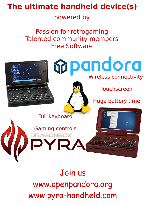 How about: Passionate retrogaming free software community Font: open sans Points (pandora) * Open hardware *Battery life *touchscreen ----------- *more of everything (Pyra) *Backlit keyboard *Cellular modem option Bonus for making points into pictograms.