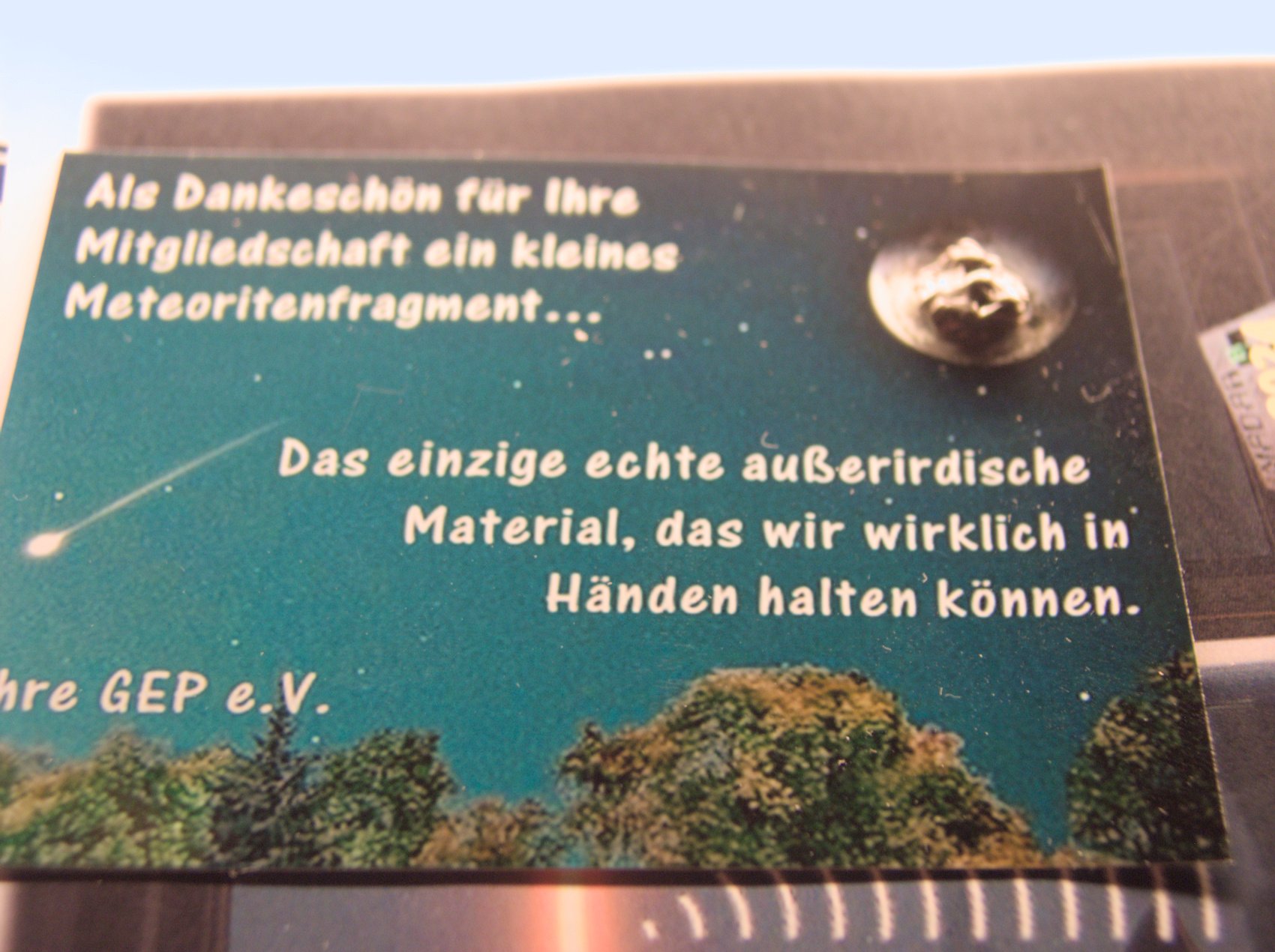 Joined the "Gesellschaft zur Erforschung des UFO-Phänomens" i.e. "UFO Phenomenon Research Society" - in short GEP - a few weeks ago. In my letterbox I was delighted to find, among a bunch of interesting reading material, a small plastic bag with an actual meteor fragment attached to a thank-you-card. Owning a legit space rock makes me feel elated. Such an unexpectedly beautiful gift, I almost cried.