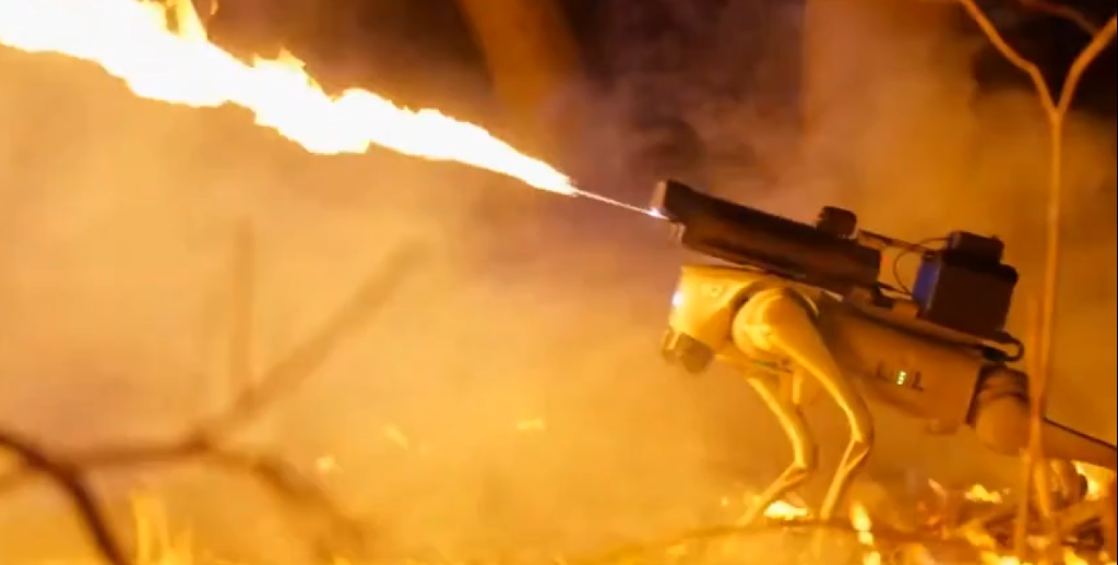 It appears someone thought it would be a great idea to attach a flamethrower to a robot dog